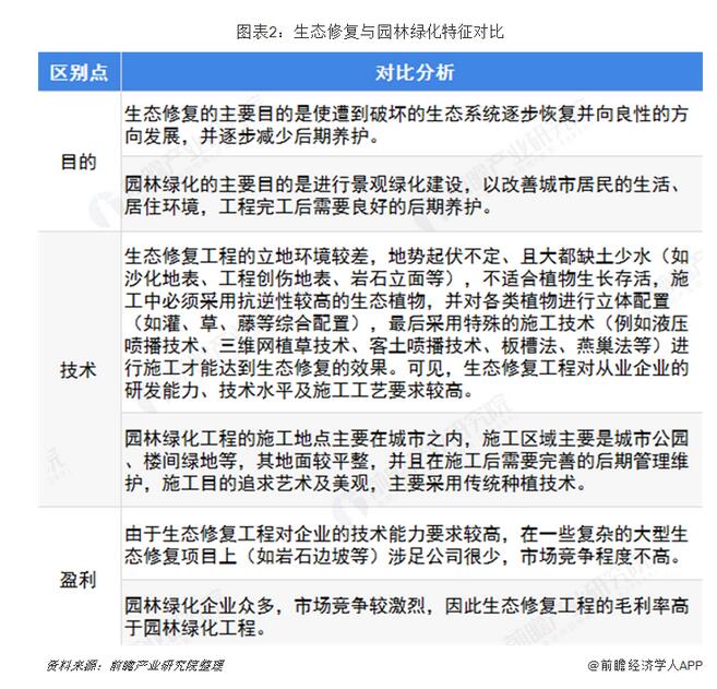 从行业发展来看,早期的生态绿化环境建设主要是市政园林建设。近年来,由于我国城市化进程的加快和房地产的迅速发展,地产景观建设也取得了迅速发展。生态修复及园林绿化都以有生命的植物为实施对象,同属于生态环境建设的范畴,但生态修复与园林绿化还存在本质的差距。主要区别在于目的、技术和盈利三个方面。