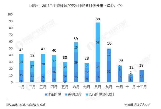 行业在发展中不断创新,开拓出生态环保行业另一个重要领域。PPP模式作为政府与社会资本合作的一种模式,既能够分担投资风险,又能保障社会投资者的基本收益。2018年,投资项目主要集中在8月,金额大部分投入执行阶段,入库PPP项目数共计4033个,落地项目1285个,落地率为32%。入库生态环保PPP项目数466个,投资总额4607.65亿元,其中落地项目188个,投资总额1855.21亿元,落地率40%。总体来说,生态环保PPP项目的落地率都高于平均水平。