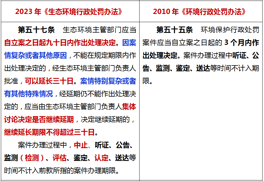 同时,还新增了“因案情复杂或者其他原因,经生态环境主管部门负责人批准,可以延长三十日”以及“案情特别复杂或者有其他特殊情况,经延期仍不能作出处理决定的,应当由生态环境主管部门负责人集体讨论决定是否继续延期,决定继续延期的,继续延长期限不得超过三十日”的规定。