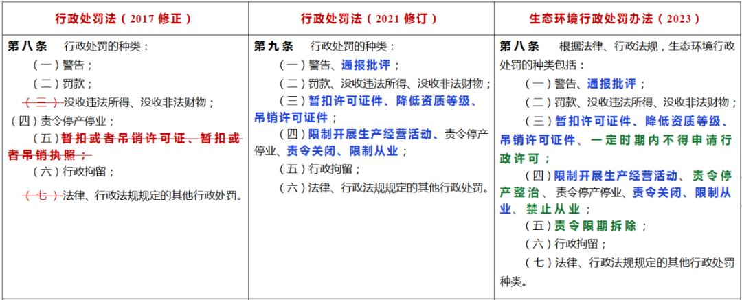 同时,还按照近年来新修订的生态环境法律法规新增的对违法行为的处罚,补充了“一定时期内不得申请行政许可”“责令停产整治”“责令限期拆除”“禁止从业”等处罚种类。