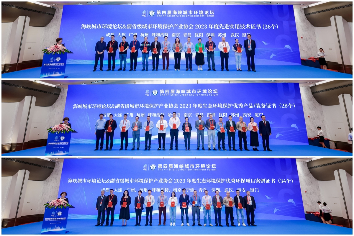 在此次两岸论坛中,共颁发了三项证书,其中,《海峡城市环境论坛&副省级城市环境保护产业协会 2023 年度先进实用技术证书》由青岛华世洁环保科技有限公司、青岛中亚环保工程有限公司和青岛思普润水处理股份有限公司获得,《海峡城市环境论坛&副省级城市环境保护产业协会 2023 年度生态环境保护优秀产品/装备证书》由青岛容广电子技术有限公司获得,《海峡城市环境论坛&副省级城市环境保护产业协会 2023 年度生态环境保护优秀环保项目案例证书》由青岛吉美来科技有限公司获得,他们的杰出贡献在城市环境保护领域树立了典范。